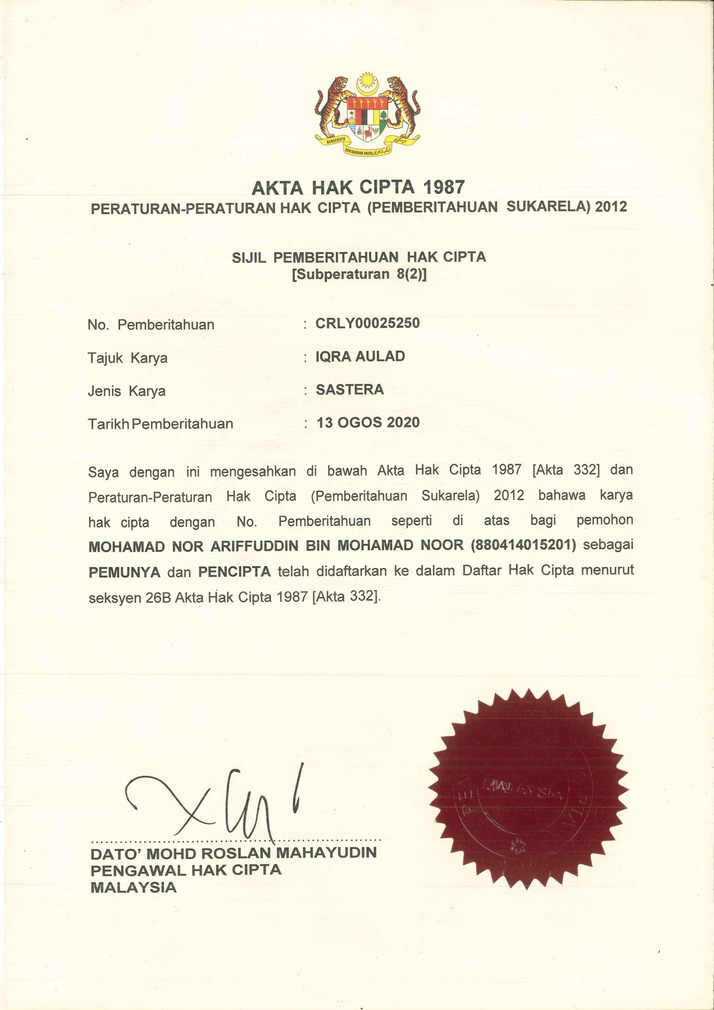 Barangsiapa yang mengeluar ulang modul Iqra aulad yang fizikal atau digital secara screenshot atau tangkapan gambar adalah tidak dibenarkan dan salah di sisi undang-undang.